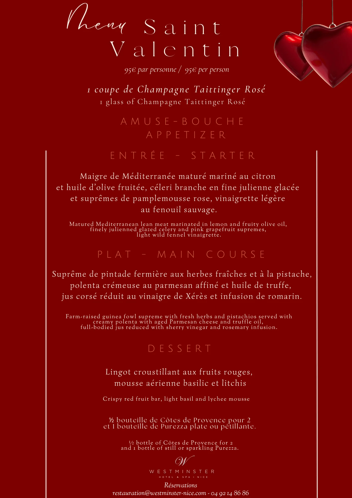 Dans une atmosphère feutrée et intimiste, laissez-vous séduire par un dîner d'exception, spécialement imaginé pour célébrer l'amour, sublimé par une animation musicale en live qui accompagnera chaque instant de la soirée.